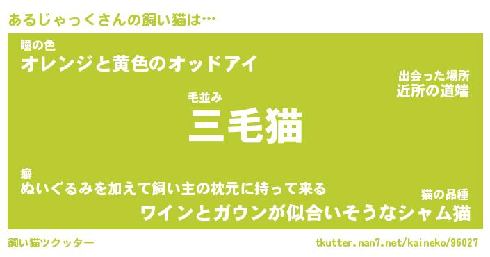 あるじゃっくさんの飼い猫は… 毛並み『三毛猫』瞳の色『オレンジと黄色のオッドアイ』猫の品種『ワインとガウンが似合いそうなシャム猫』 ツクッター #飼い猫ツクッター http://tkutter.nan7.net/kaineko/96027/