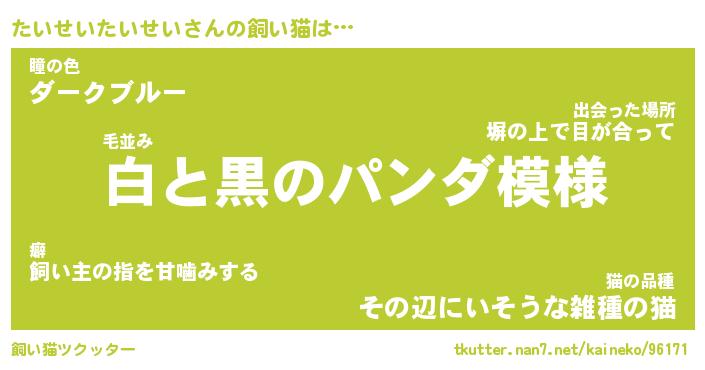 たいせいたいせいさんの飼い猫は… 毛並み『白と黒のパンダ模様』瞳の色『ダークブルー』猫の品種『その辺にいそうな雑種の猫』 ツクッター #飼い猫ツクッター http://tkutter.nan7.net/kaineko/96171/