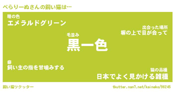 ぺらりーぬさんの飼い猫は… 毛並み『黒一色』瞳の色『エメラルドグリーン』猫の品種『日本でよく見かける雑種』 ツクッター #飼い猫ツクッター http://tkutter.nan7.net/kaineko/96245/
