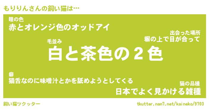 もりりんさんの飼い猫は… 毛並み『白と茶色の2色』瞳の色『赤とオレンジ色のオッドアイ』猫の品種『日本でよく見かける雑種』 ツクッター #飼い猫ツクッター http://tkutter.nan7.net/kaineko/9703/