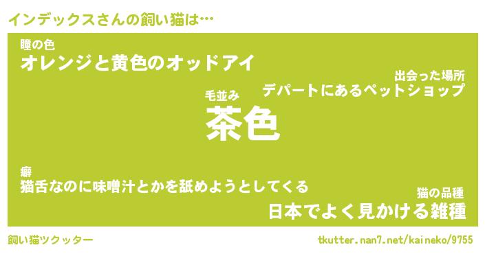 インデックスさんの飼い猫は… 毛並み『茶色』瞳の色『オレンジと黄色のオッドアイ』猫の品種『日本でよく見かける雑種』 ツクッター #飼い猫ツクッター http://tkutter.nan7.net/kaineko/9755/