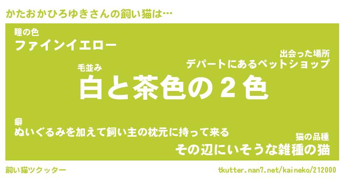 かたおかひろゆきさんの飼い猫は… 毛並み『白と茶色の2色』瞳の色『ファインイエロー』猫の品種『その辺にいそうな雑種の猫』 ツクッター #飼い猫ツクッター http://tkutter.nan7.net/kaineko/212000/