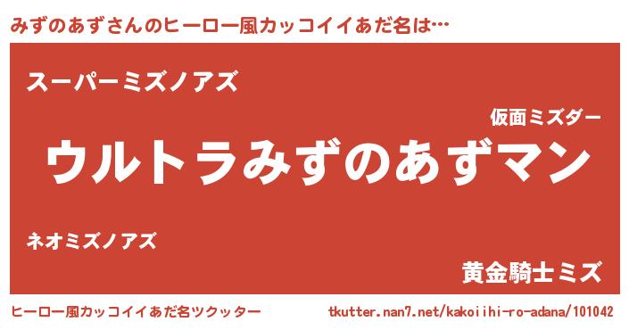 | 男性向けラノベタイトル風あだ名 | 『みずのあずに滅ぼされるだけの簡単なお仕事です』 |