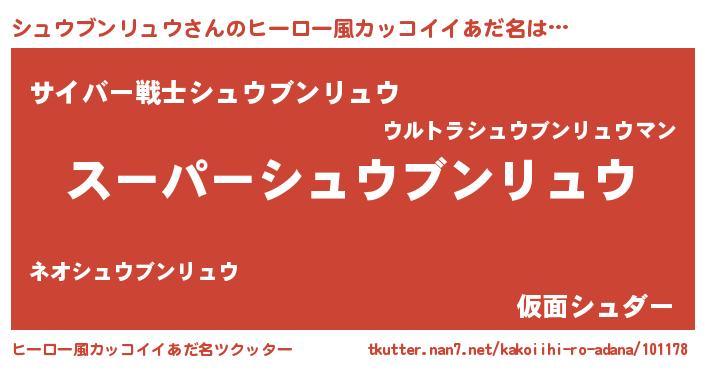 | 男性向けラノベタイトル風あだ名 | 『シュウブンリュウアートオンライン』 |