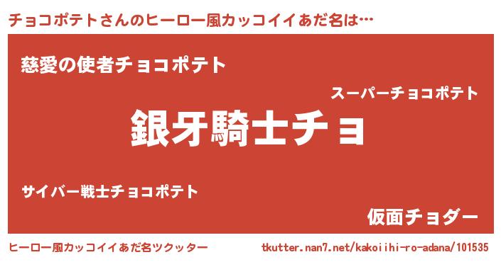 | 女子向けラノベタイトル風あだ名 | 『チョコポテトの卵を拾いまして』 |