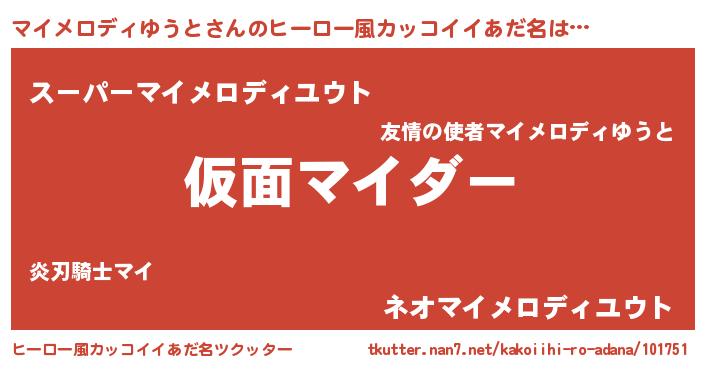 | 男性向けラノベタイトル風あだ名 | 『マイメロディゆうと~年齢イコール彼女いない歴の魔法使い~』 |
