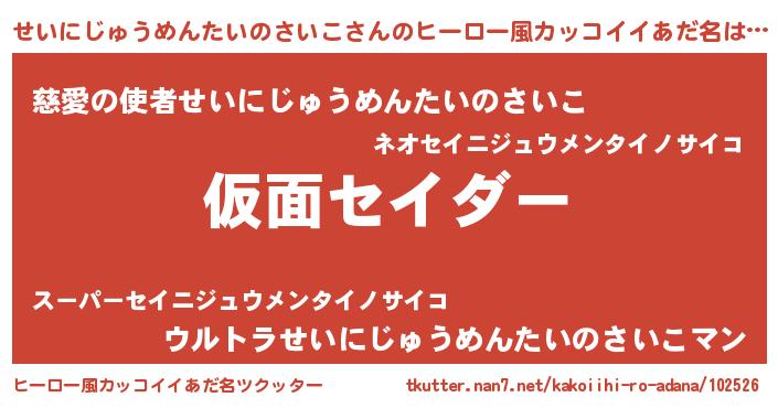 | 意味不明あだ名 | 『住所不定無職せいにじゅうめんたいのさいこ(98歳)』 |