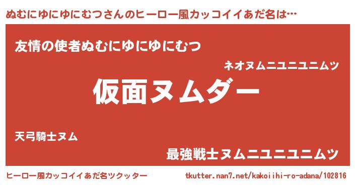 | 男性向けラノベタイトル風あだ名 | 『ぬむにゆにゆにむつに滅ぼされるだけの簡単なお仕事です』 |