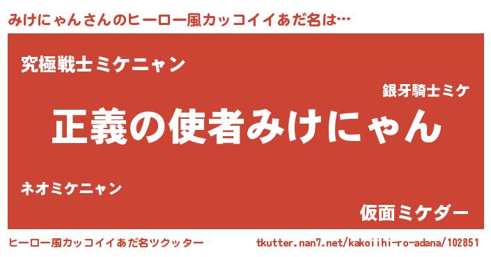 | 女子向けラノベタイトル風あだ名 | 『みけにゃん夫妻のなれそめ』 |