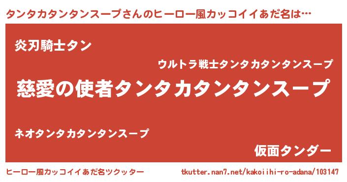| 女子向けラノベタイトル風あだ名 | 『死神タンタカタンタンスープの再婚』 |