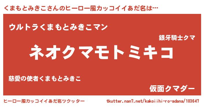 | 女子向けラノベタイトル風あだ名 | 『くまもとみきこの契約王妃』 |