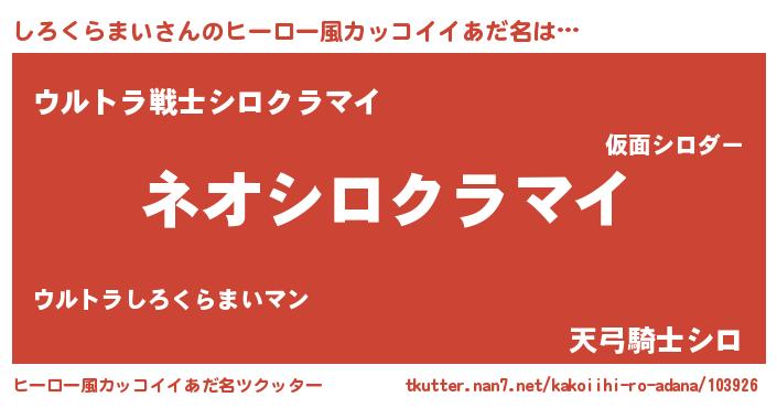 | 男性向けラノベタイトル風あだ名 | 『しろくらまいという概念が存在しない退屈な世界 』 |