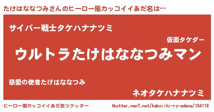 | 男性向けラノベタイトル風あだ名 | 『たけはななつみに滅ぼされるだけの簡単なお仕事です』 |