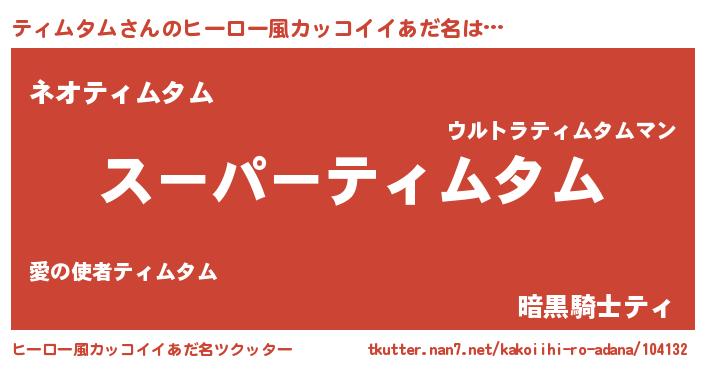 | 男性向けラノベタイトル風あだ名 | 『ティムタム~年齢イコール彼女いない歴の魔法使い~』 |