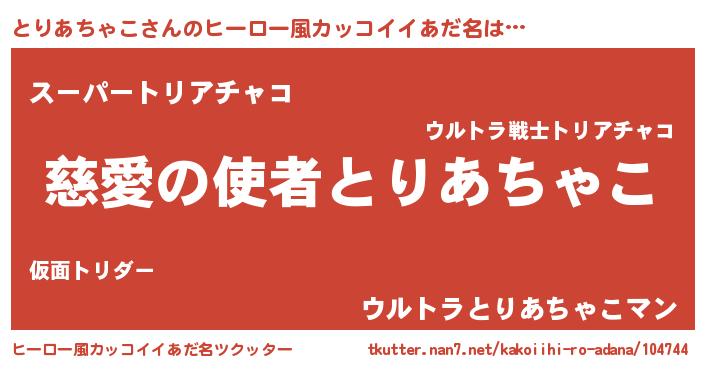 | 男性向けラノベタイトル風あだ名 | 『転生したらとりあちゃこだった件』 |