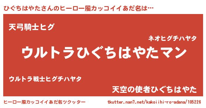 | 男性向けラノベタイトル風あだ名 | 『ひぐちはやた~年齢イコール彼女いない歴の魔法使い~』 |