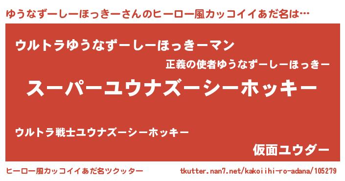 | 男性向けラノベタイトル風あだ名 | 『ゆうなずーしーほっきー~年齢イコール彼女いない歴の魔法使い~』 |