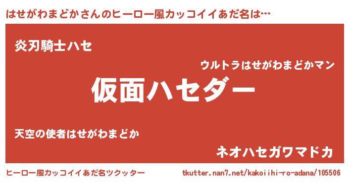 | 男性向けラノベタイトル風あだ名 | 『魔弾の王とはせがわまどか』 |