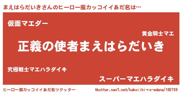 | 男性向けラノベタイトル風あだ名 | 『おまえをオタクにしてやるから、俺をまえはらだいきにしてくれ! 』 |