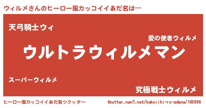 | 男性向けラノベタイトル風あだ名 | 『ウィルメ~年齢イコール彼女いない歴の魔法使い~』 |