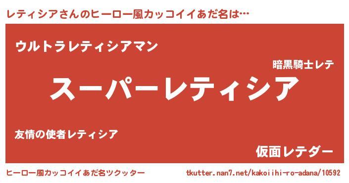 | 男性向けラノベタイトル風あだ名 | 『レティシア~年齢イコール彼女いない歴の魔法使い~』 |