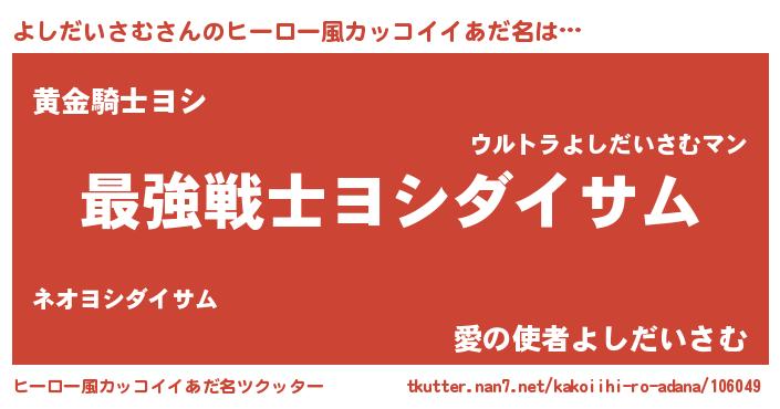 | 男性向けラノベタイトル風あだ名 | 『よしだいさむ~年齢イコール彼女いない歴の魔法使い~』 |