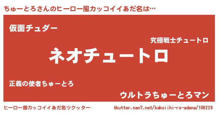 | 男性向けラノベタイトル風あだ名 | 『ちゅーとろという概念が存在しない退屈な世界 』 |
