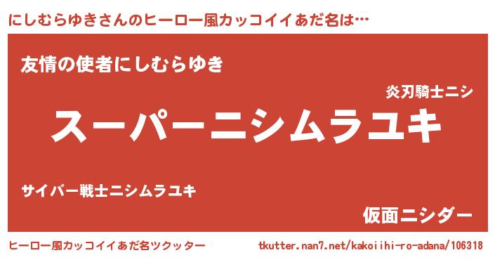 | 女子向けラノベタイトル風あだ名 | 『(仮)にしむらゆきのやんごとなき事情』 |