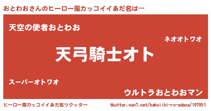| 男性向けラノベタイトル風あだ名 | 『おとわおの嫁は女の子じゃないと思った?』 |