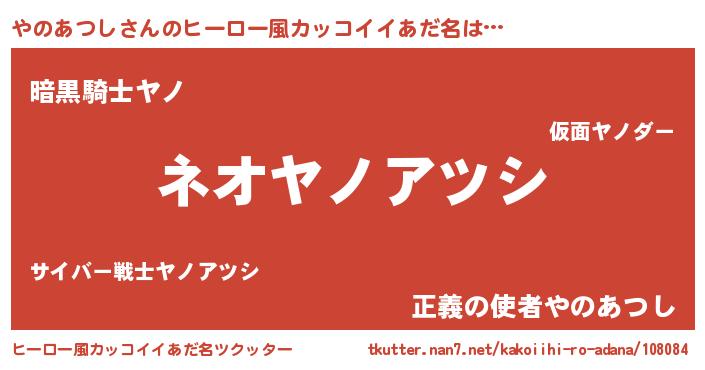 | 女子向けラノベタイトル風あだ名 | 『異世界で失敗しない100のやのあつし』 |