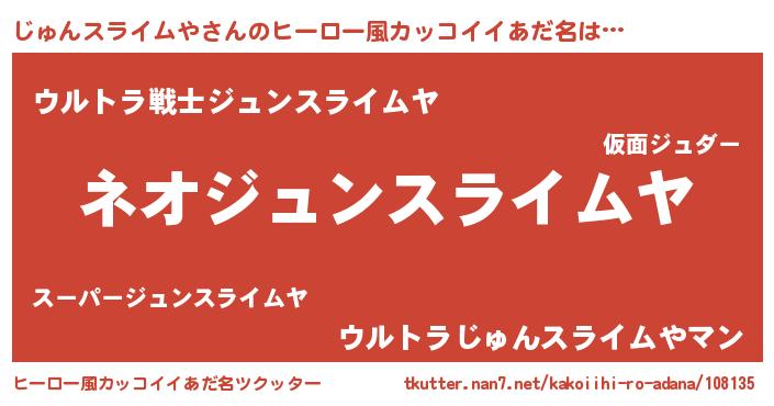 | 男性向けラノベタイトル風あだ名 | 『じゅんスライムやという概念が存在しない退屈な世界 』 |