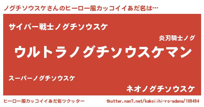 | 男性向けラノベタイトル風あだ名 | 『ノグチソウスケ~年齢イコール彼女いない歴の魔法使い~』 |