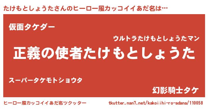 | 男性向けラノベタイトル風あだ名 | 『おまえをオタクにしてやるから、俺をたけもとしょうたにしてくれ! 』 |