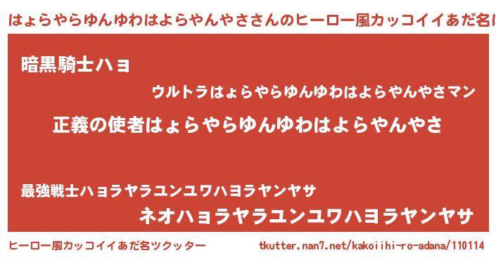 | 男性向けラノベタイトル風あだ名 | 『はたらくはょらやらゆんゆわはよらやんやささま!』 |