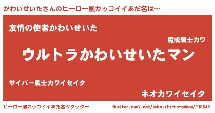 | 男性向けラノベタイトル風あだ名 | 『かわいせいた~年齢イコール彼女いない歴の魔法使い~』 |