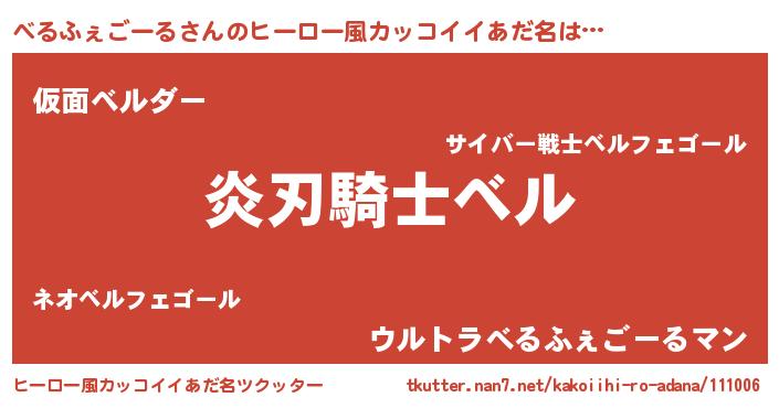 | 男性向けラノベタイトル風あだ名 | 『べるふぇごーる~年齢イコール彼女いない歴の魔法使い~』 |