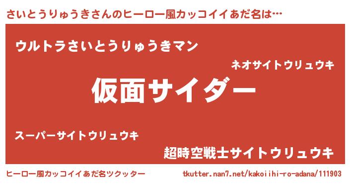 | 意味不明あだ名 | 『住所不定無職さいとうりゅうき(89歳)』 |