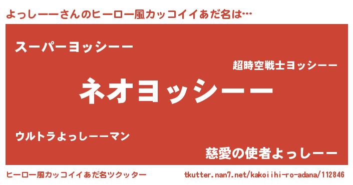 | 男性向けラノベタイトル風あだ名 | 『よっしーー~年齢イコール彼女いない歴の魔法使い~』 |