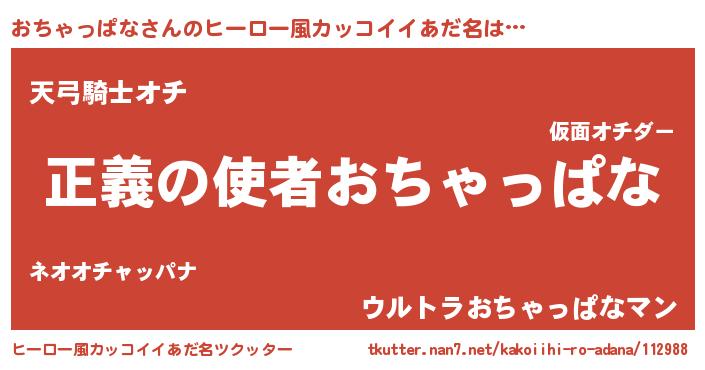 | 男性向けラノベタイトル風あだ名 | 『おまえをオタクにしてやるから、俺をおちゃっぱなにしてくれ! 』 |