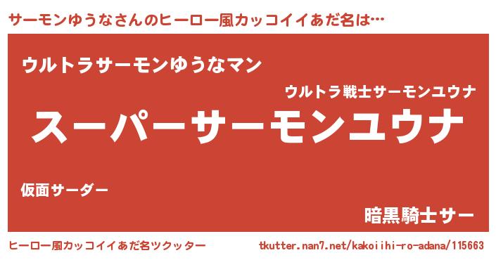 | 男性向けラノベタイトル風あだ名 | 『サーモンゆうな~年齢イコール彼女いない歴の魔法使い~』 |