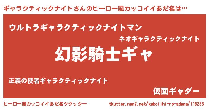 | 男性向けラノベタイトル風あだ名 | 『ギャラクティックナイトの嫁は女の子じゃないと思った?』 |