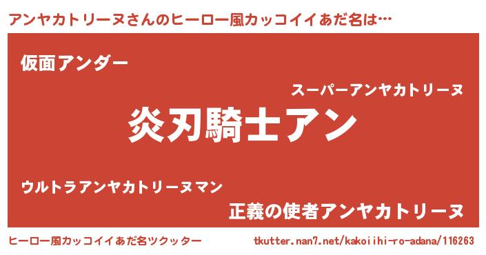 | 女子向けラノベタイトル風あだ名 | 『アンヤカトリーヌの玉の輿計画!』 |