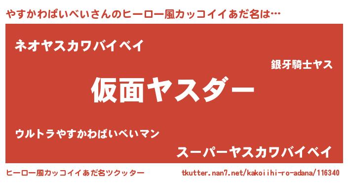 | 男性向けラノベタイトル風あだ名 | 『この素晴らしい世界にやすかわばいべいを!』 |