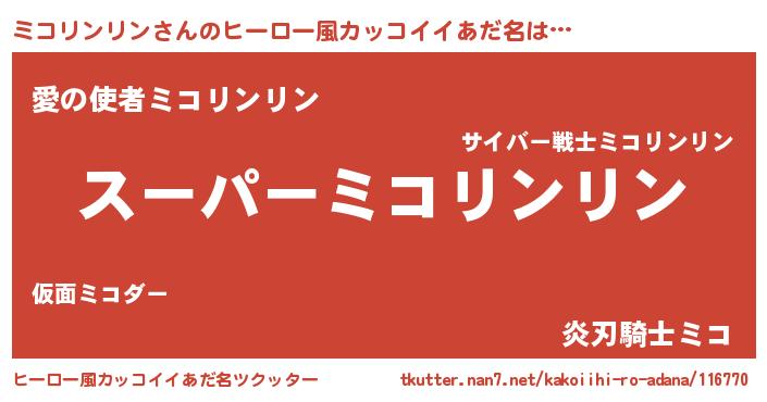 | 男性向けラノベタイトル風あだ名 | 『ミコリンリンの憂鬱』 |