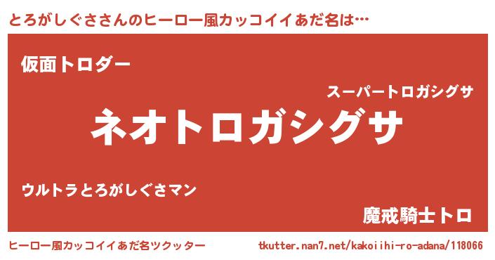 | 男性向けラノベタイトル風あだ名 | 『とろがしぐさという概念が存在しない退屈な世界 』 |