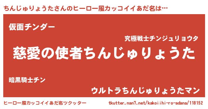| 女子向けラノベタイトル風あだ名 | 『死神ちんじゅりょうたの再婚』 |