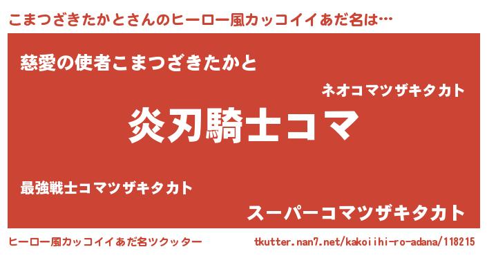| 男性向けラノベタイトル風あだ名 | 『こまつざきたかと~年齢イコール彼女いない歴の魔法使い~』 |