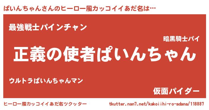 | 男性向けラノベタイトル風あだ名 | 『おまえをオタクにしてやるから、俺をぱいんちゃんにしてくれ! 』 |