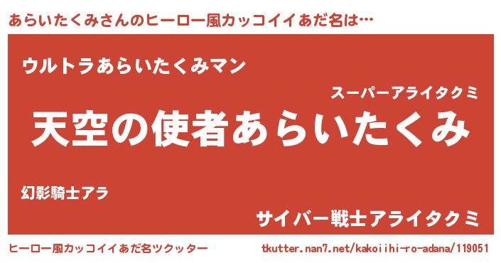 | 男性向けラノベタイトル風あだ名 | 『うちのあらいたくみが世界を掌握している!』 |
