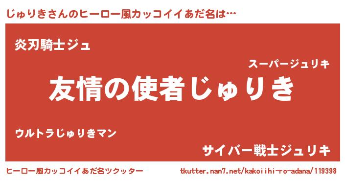 | 男性向けラノベタイトル風あだ名 | 『おまえをオタクにしてやるから、俺をじゅりきにしてくれ! 』 |